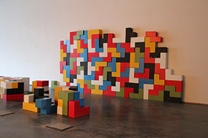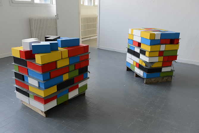 M’intéressant au casse-tête mécanique et au jeu d’assemblage, j’ai réalisé quatre formes en série de manière à produire 188 volumes que l’on peut assembler. Les formes sont empruntées à l’univers des jeux éducatifs tandis que la peinture utilisée sert dans la signalétique routière. Cette pièce fonctionne comme un jeu à grande échelle mais aussi sur l’idée d’une activation d’un chantier participatif.