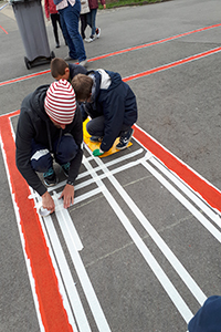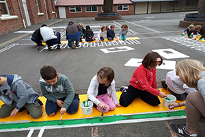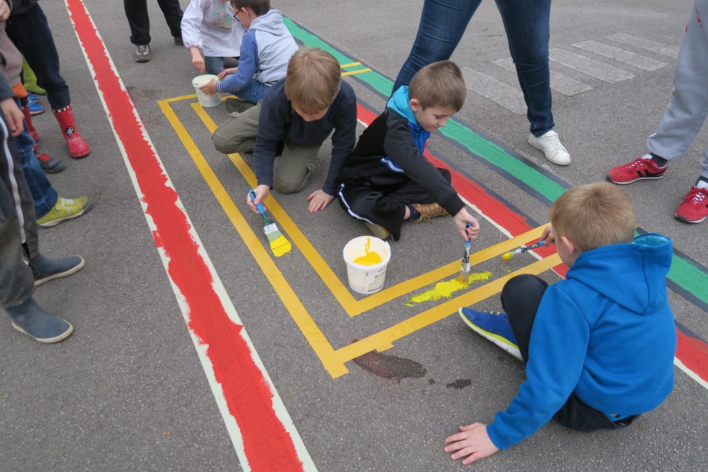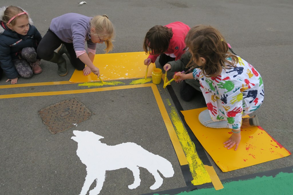 l’espace gris inanimé de la cour de récré en un paysage foisonnant de surprises colorées.