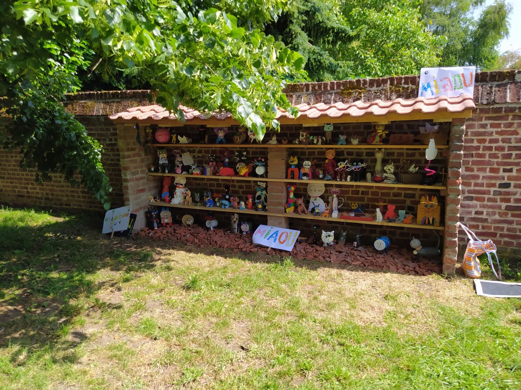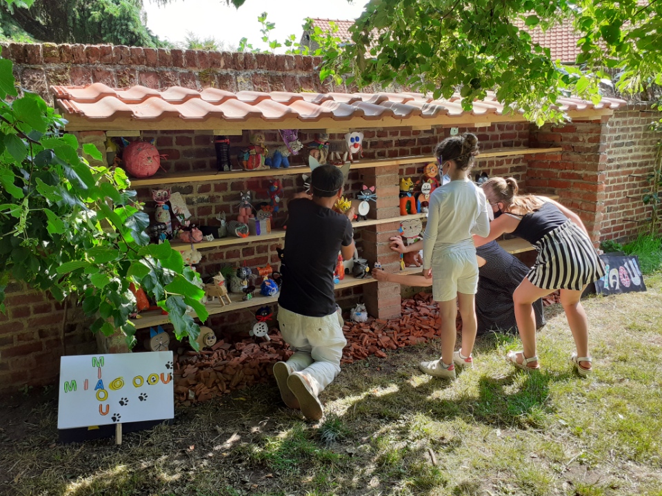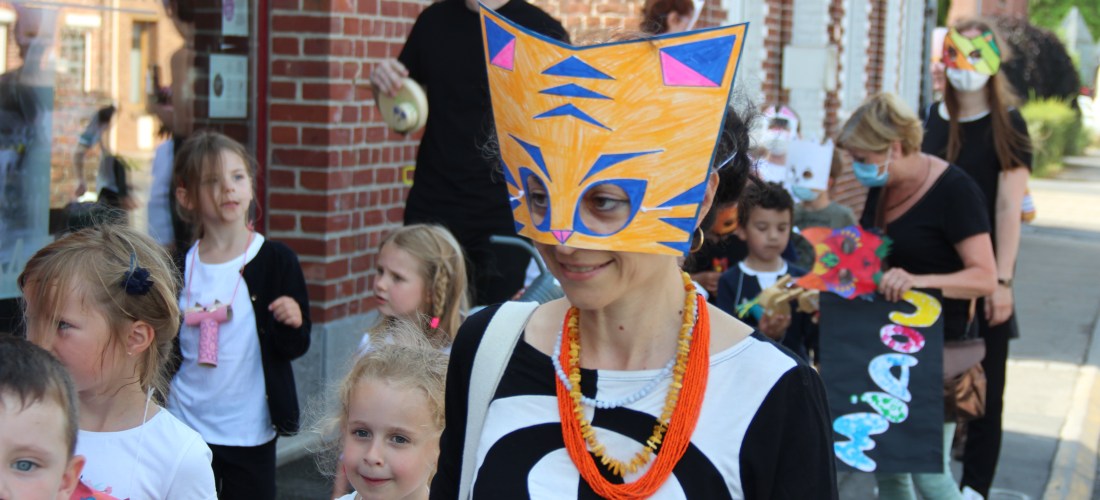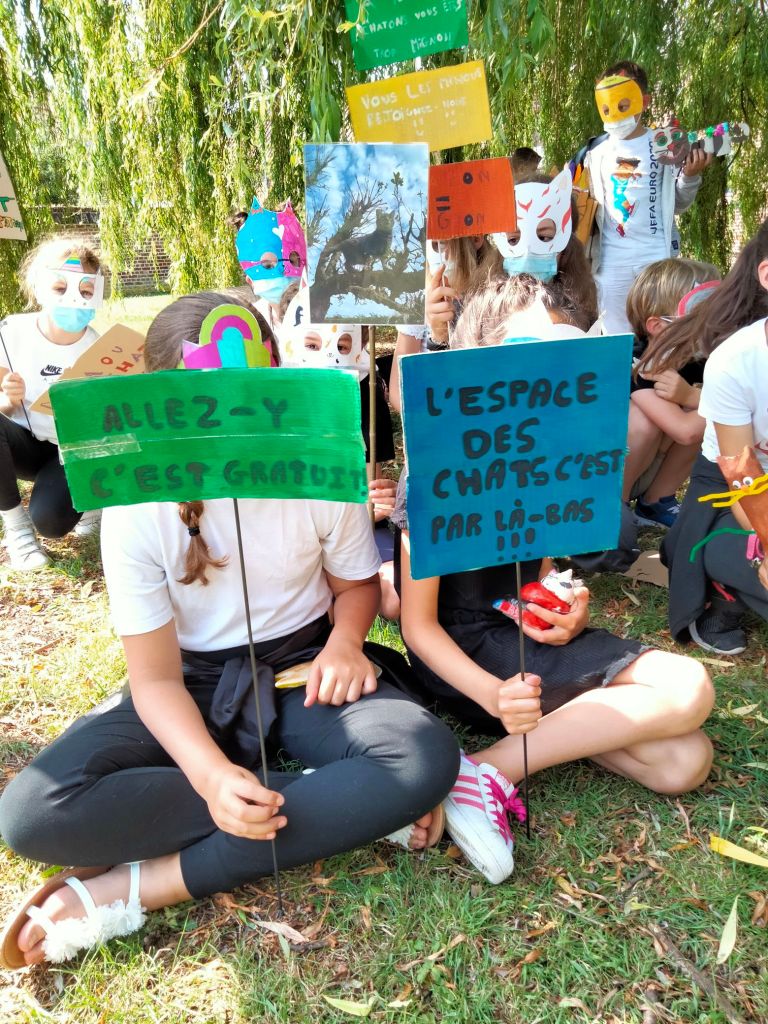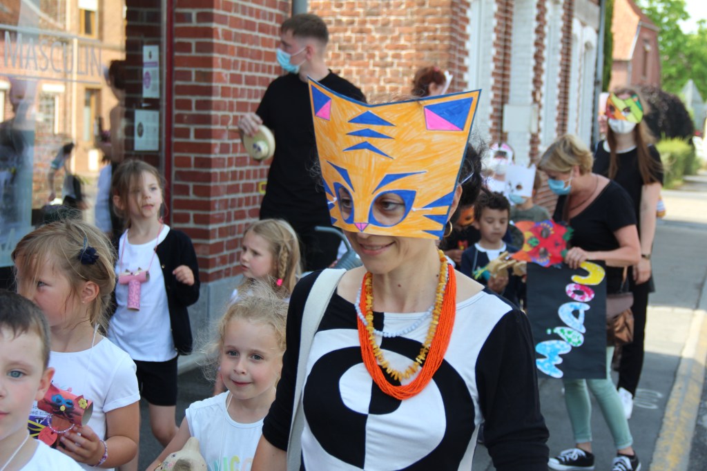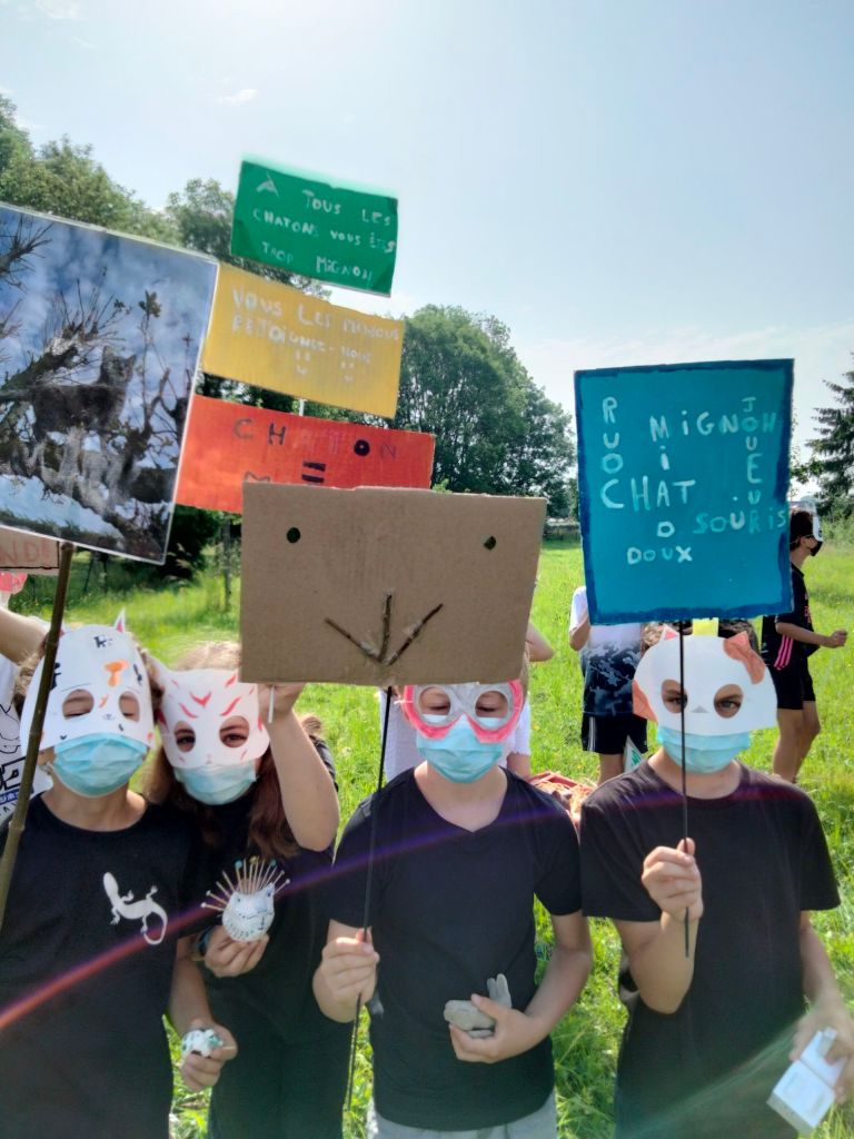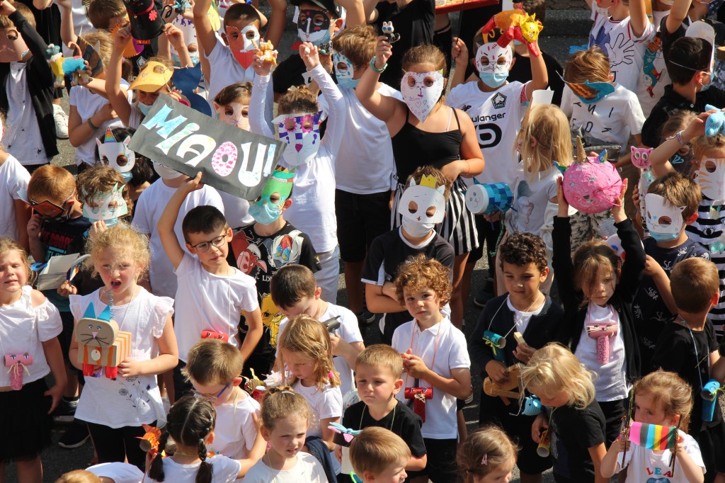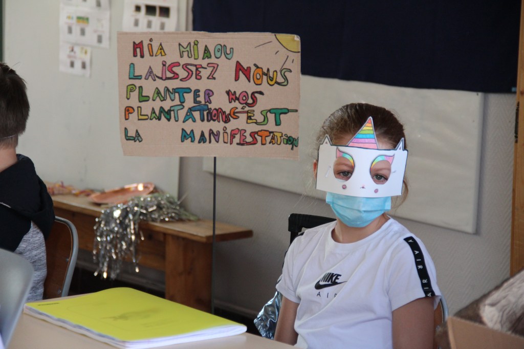Une école envahie par les chats, ça n’existe pas… Et pourtant… Dans ce milieu rural, les chats avaient pris possession de la cour de l’école maternelle. Prenant le prétexte de leur invasion, les ressorts de la construction d’une nation ont été utilisés dans un projet artistique à l’effigie des chats. Après avoir revêtu l’uniforme de chat (masque), écrit les revendications poétiques de la population, créé un hymne (une Marseillaise de miaou), une procession a été mise en œuvre vers l’école élémentaire. Parallèlement à cela et afin de conserver le lien collectif, pendant le confinement le projet a trouvé une nouvelle source d’inspiration: chaque enfant a pu créer son chat imaginaire qui a été déposé dans un autel à chats lors des retrouvailles.