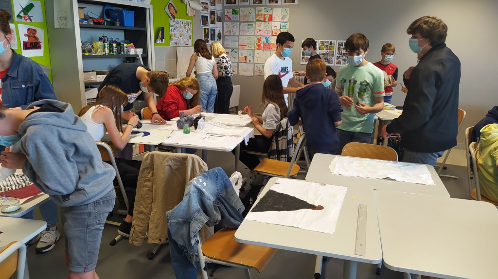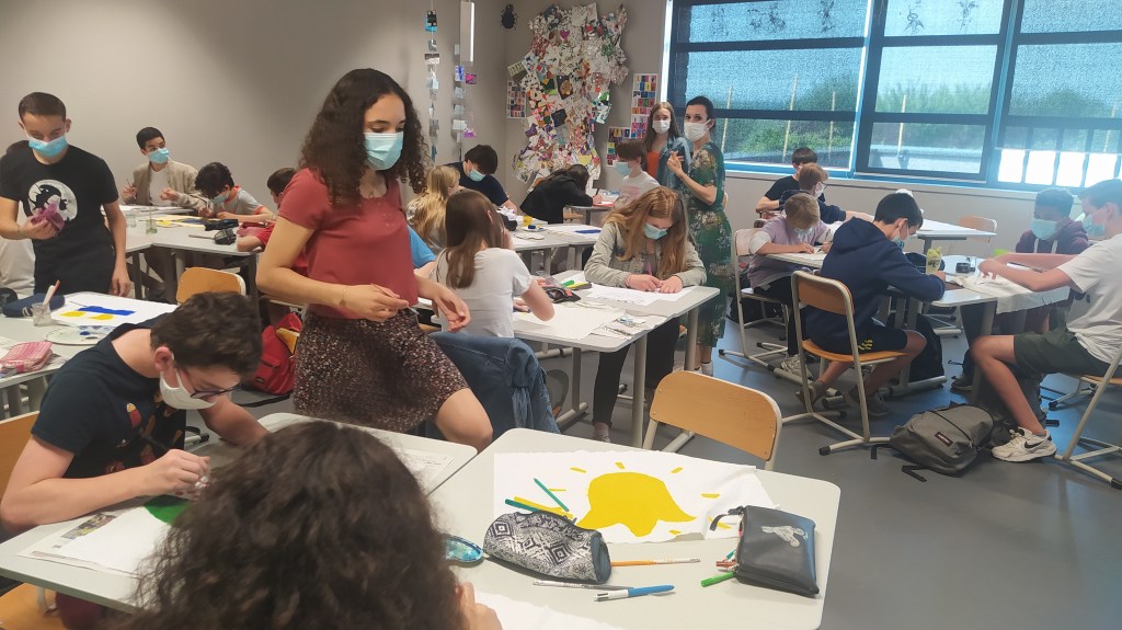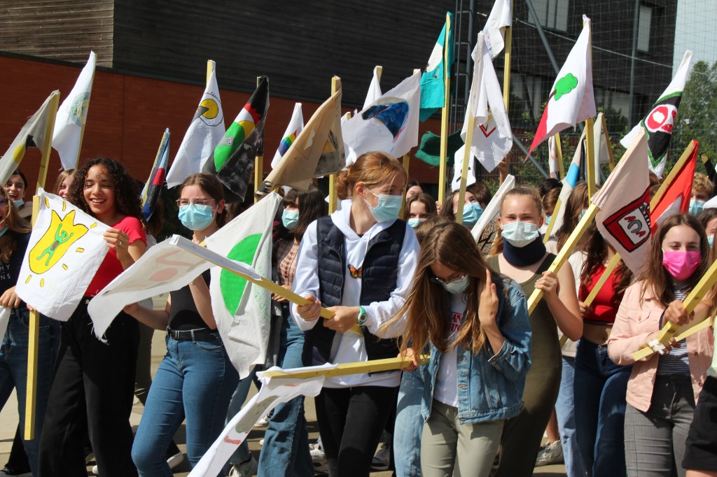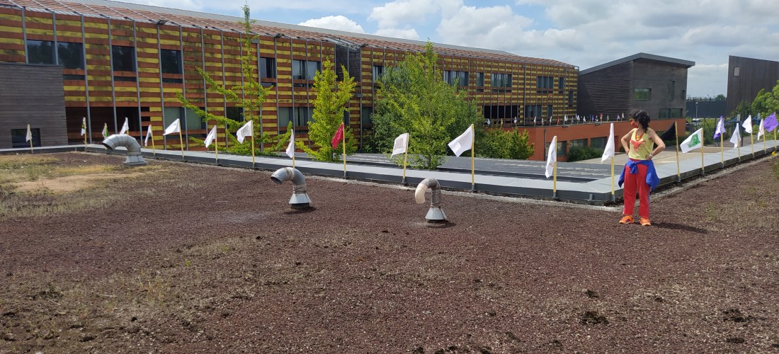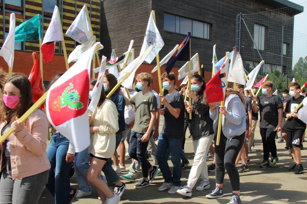 Partant du constat du manque des deux drapeaux officiels à l’entrée d’un collège, collège situé sur le territoire de l’entreprise Doublet (spécialisée dans la confection de drapeaux), il a été proposé aux élèves de marquer leur territoire. Ainsi, tels des découvreurs de nouvelles terres plantant leurs drapeaux sur un territoire vierge, les collégiens ont été invités à réfléchir à l’utilisation d’espaces non exploités au sein même de l’établissement. Le toit terrasse a été retenu comme un espace vierge et invisible mais qui offre à la fois toute la visibilité nécessaire. A travers cette prise de hauteur, les élèves ont donc développé leur propre iconographie entre revendication et histoire collective. Ils ont déambulé avec les 160 drapeaux créés avant de les planter fièrement.