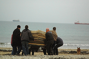 L’équipage rassemblé a alors effectué, dans la tradition, une première mise à l’eau de manière festive en déposant à la force des bras le bateau à la mer: concrétisation du chantier naval précédemment entrepris.