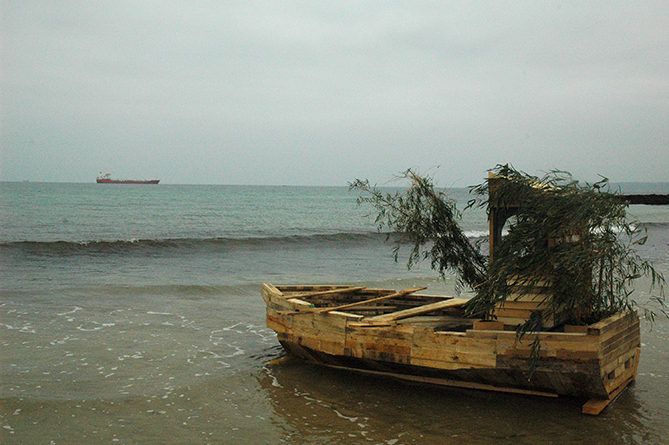 Après une première mise à l’eau, le bateau devait trouver son essence à travers une traversée. La traversée implique une direction, un sens puisqu’il s’agit d’aller d’une extrémité à l’autre. Le jeu des extrêmes et du gigantisme a été une nouvelle source d’inspiration pour permettre au bateau un retour à la terre originelle.